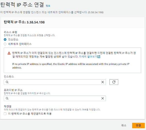 - 탄력적 IP ➡ 작업 ➡ 탄력적 IP 주소 연결