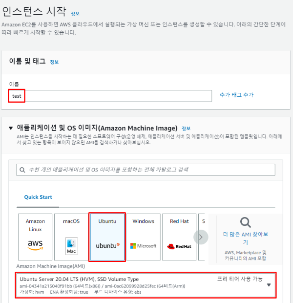 - 애플리케이션 및 OS 이미지 ➡ Ubuntu 선택 ➡ 20버전 선택
