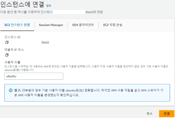 - 인스턴스 ➡ 해당 인스턴스 클릭 ➡ 연결