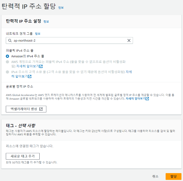 - 탄력적 IP 2개 할당(EC2 인스턴스는 동적 IP라 IP를 고정하기 위해 탄력적 IP 사용)