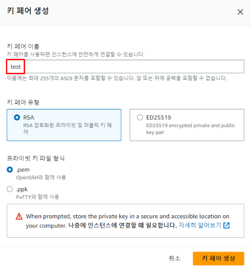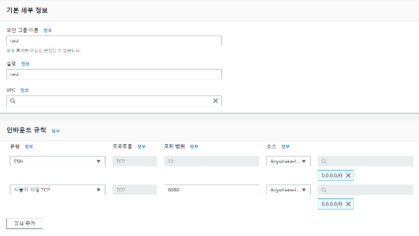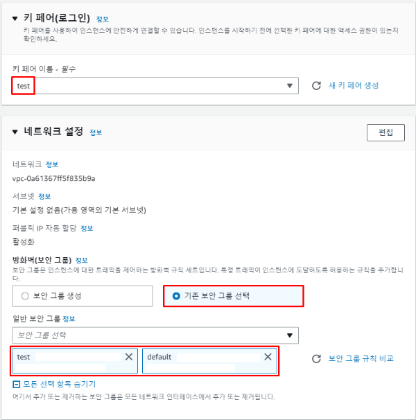 - 보안그룹 ➡ 기존 보안그룹 선택 ➡ test, default 선택