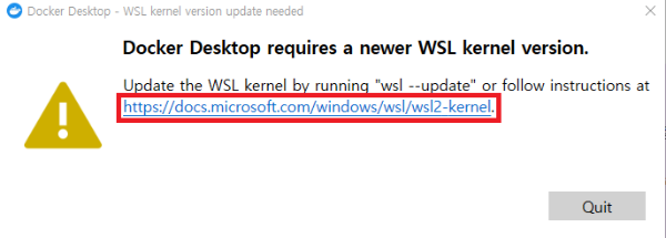 - Docker Desktop 실행 시 해당 에러 발생시 x64 머신용 최신 WSL2 Linux 커널 업데이트 패키지 설치