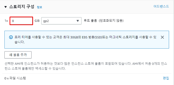 - EBS 볼륨의 최소 8GB 설정(프리티어로는 인스턴스 3개 생성 가능)